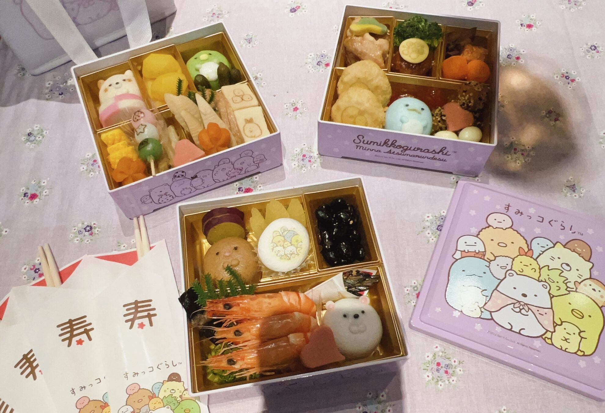 練り切り「スヌーピー」「チャーリーブラウン」・鮑旨煮・ロブスター&パセリ・レーズン&レパン・牛肉笹包み・蟹彩り巻・いくら醤油漬け&紅葉漬・ローストビーフ・若鶏醤油チーズ焼・クリームチーズダブルベリー・ローズサーモン&オニオンマリネ・鰆昆布〆・真鯛西京焼・栗きんとん・海老の旨煮など